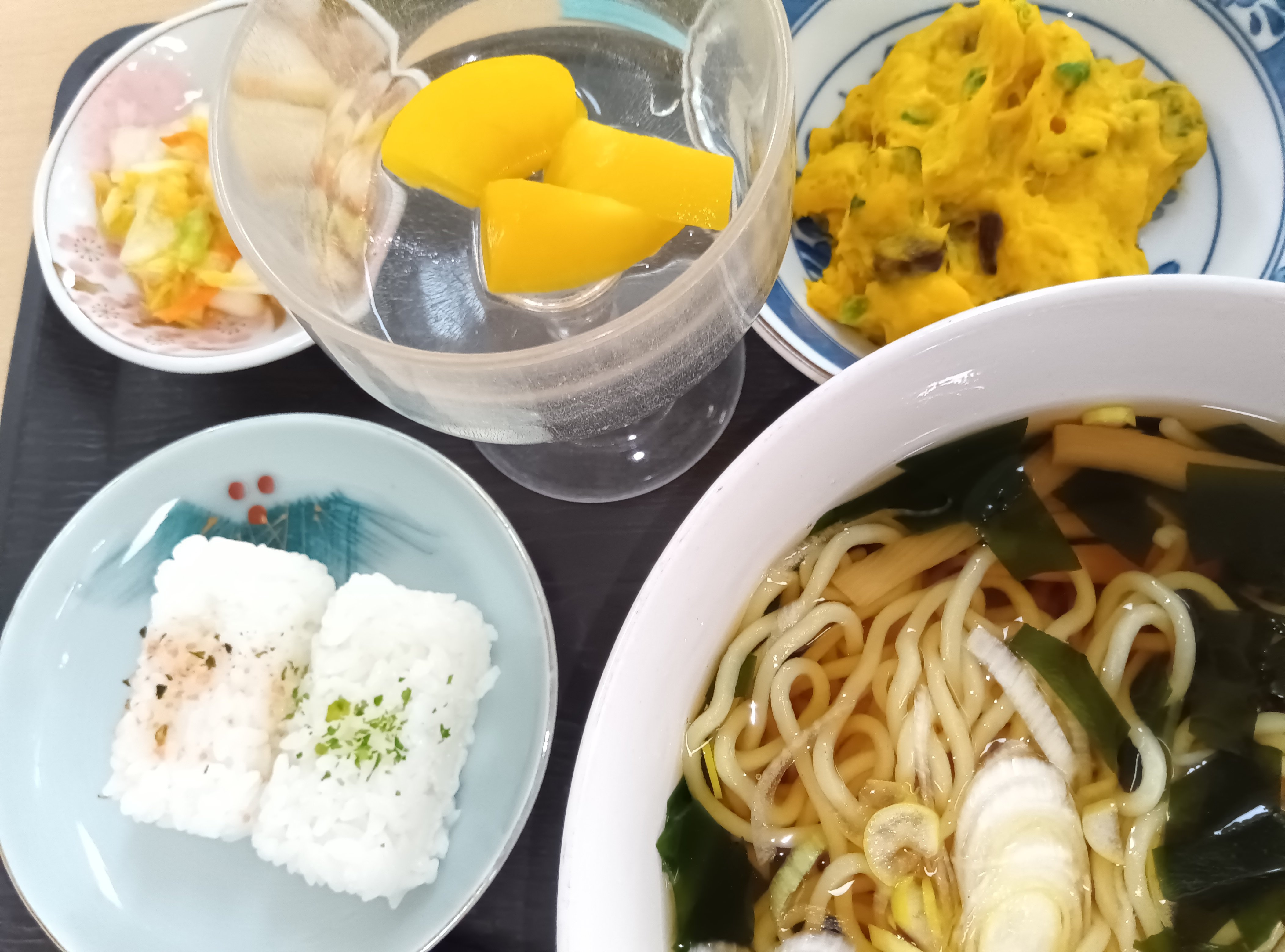 和風ラーメン、キムチ漬け、カボチャサラダ、俵おにぎりフルーツはパイナップル