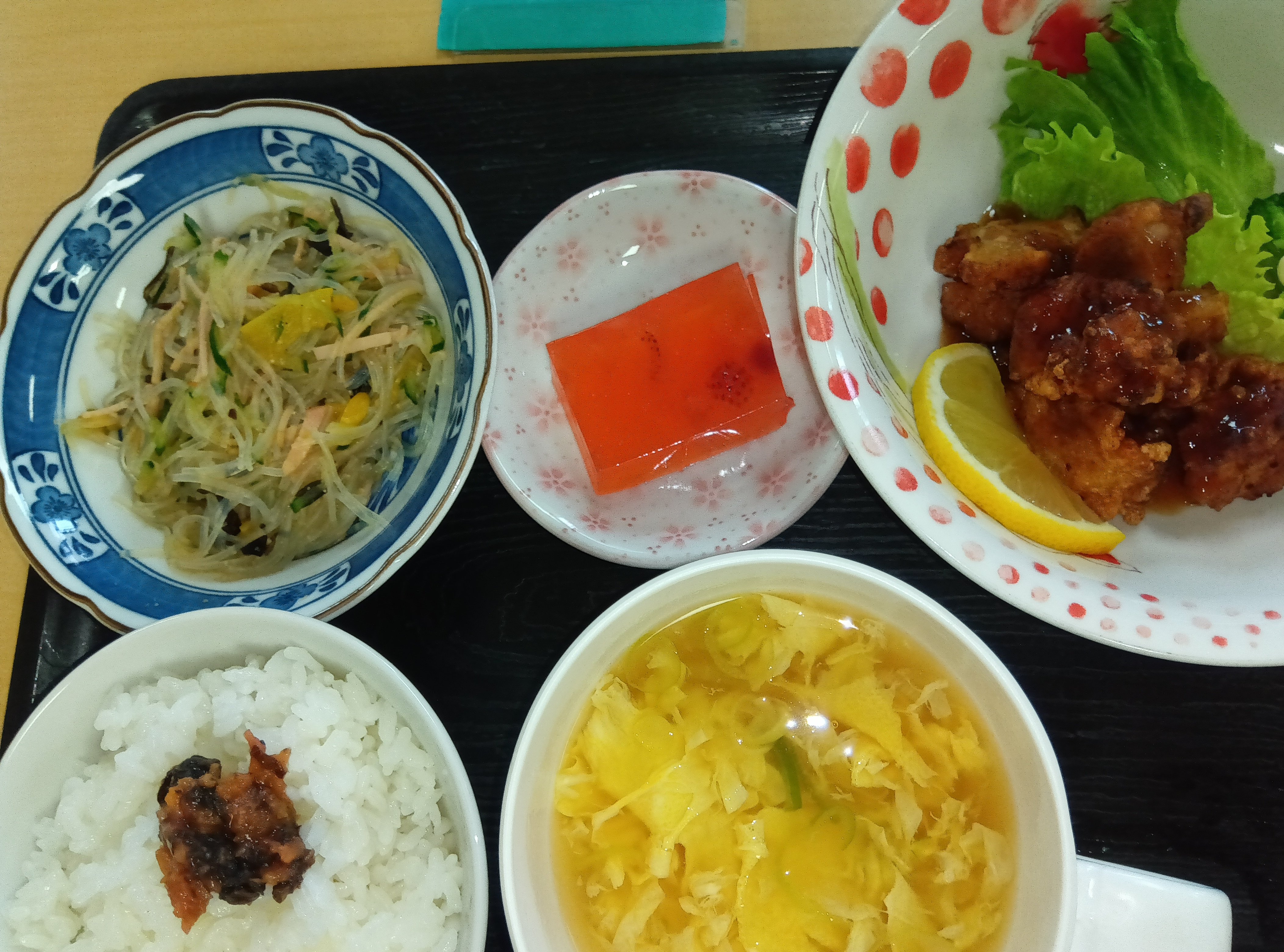 左上 中華サラダ、中央上 イチゴの寒天固め、右上 鶏唐揚げ