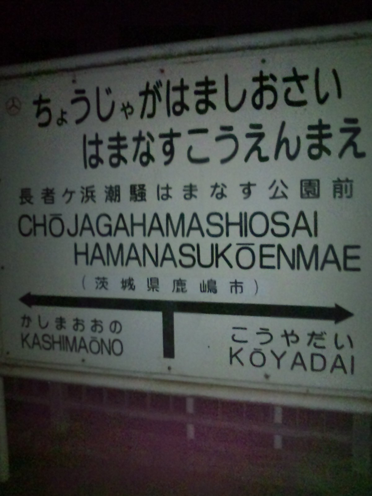 そして今日のちょっと昔の写真。今日は撮影当時、日本一長い駅名として有名になった、鹿島臨海鉄道の長者ヶ浜潮騒はまなす公園前駅の駅名標です。夜に写したので、ちょっとピントが合ってませんが、公開しますね。