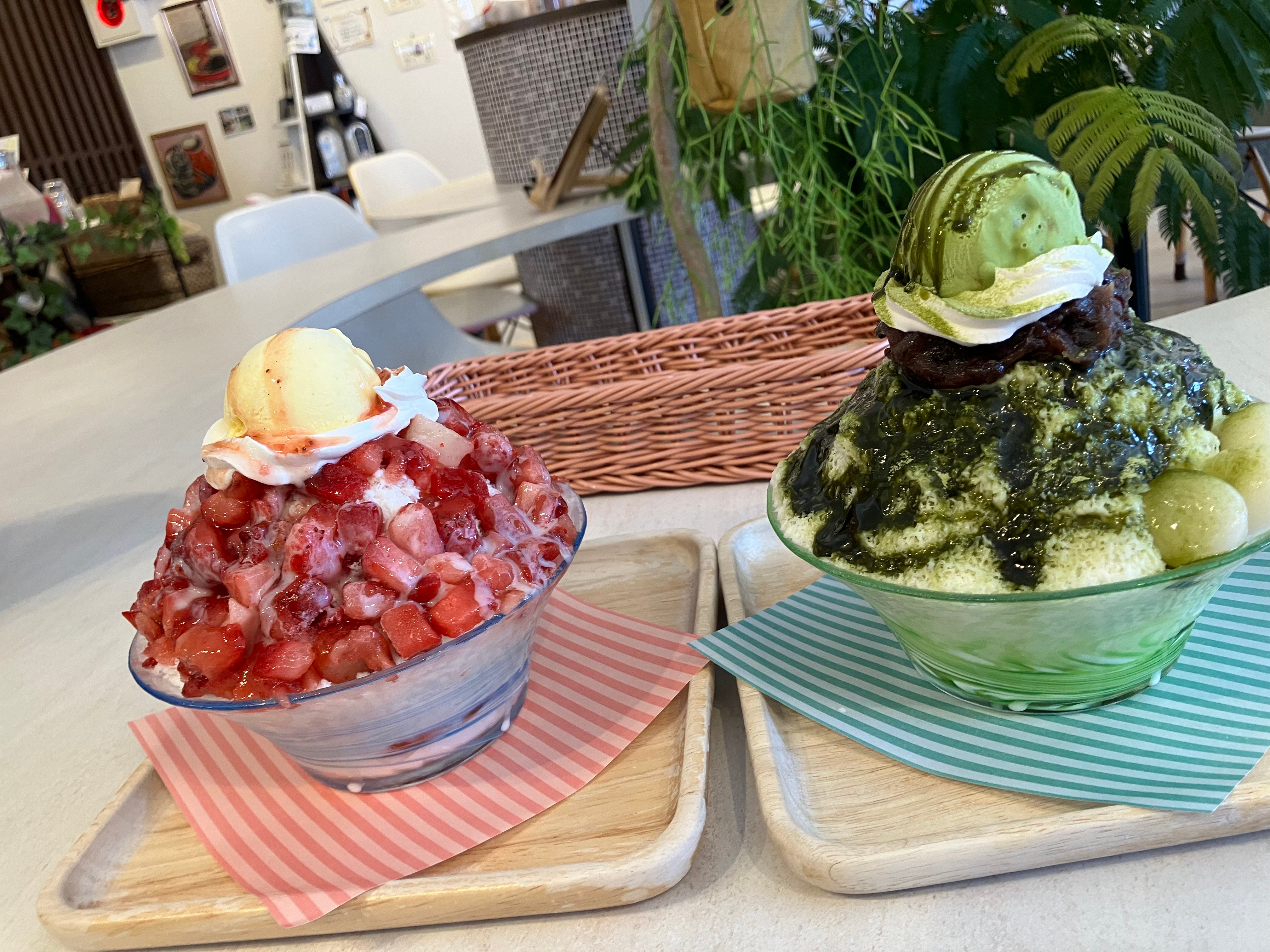いやぁ~それにしても暑いですねぇ。うだるような暑さが続いてますが、皆さん体は大丈夫です?暑くて寝苦しくて、少々寝不足気味な私です。そんな暑い毎日を送っておられる皆様に、涼しさをお届け。山口市内にあるカフェで、嫁さんと二人、かき氷を食べてきました。私は抹茶小豆、嫁さんはイチゴミルクをいただきました。冷たくて甘くて、めっちゃおいしかった~。結構ボリュームがあったのでお腹いっぱいになりました。