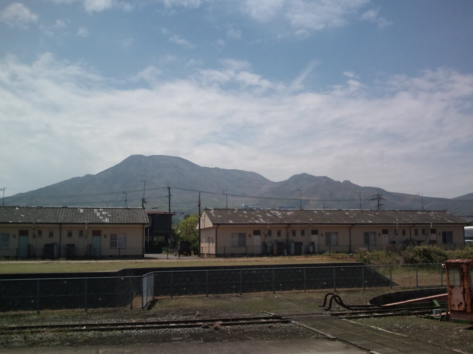 さて、今日のちょっと昔の写真ですが、2011年5月の豊肥本線の車窓から見た阿蘇山です。ここは豊肥本線の主要駅の一つ、宮地駅から眺めた風景です。