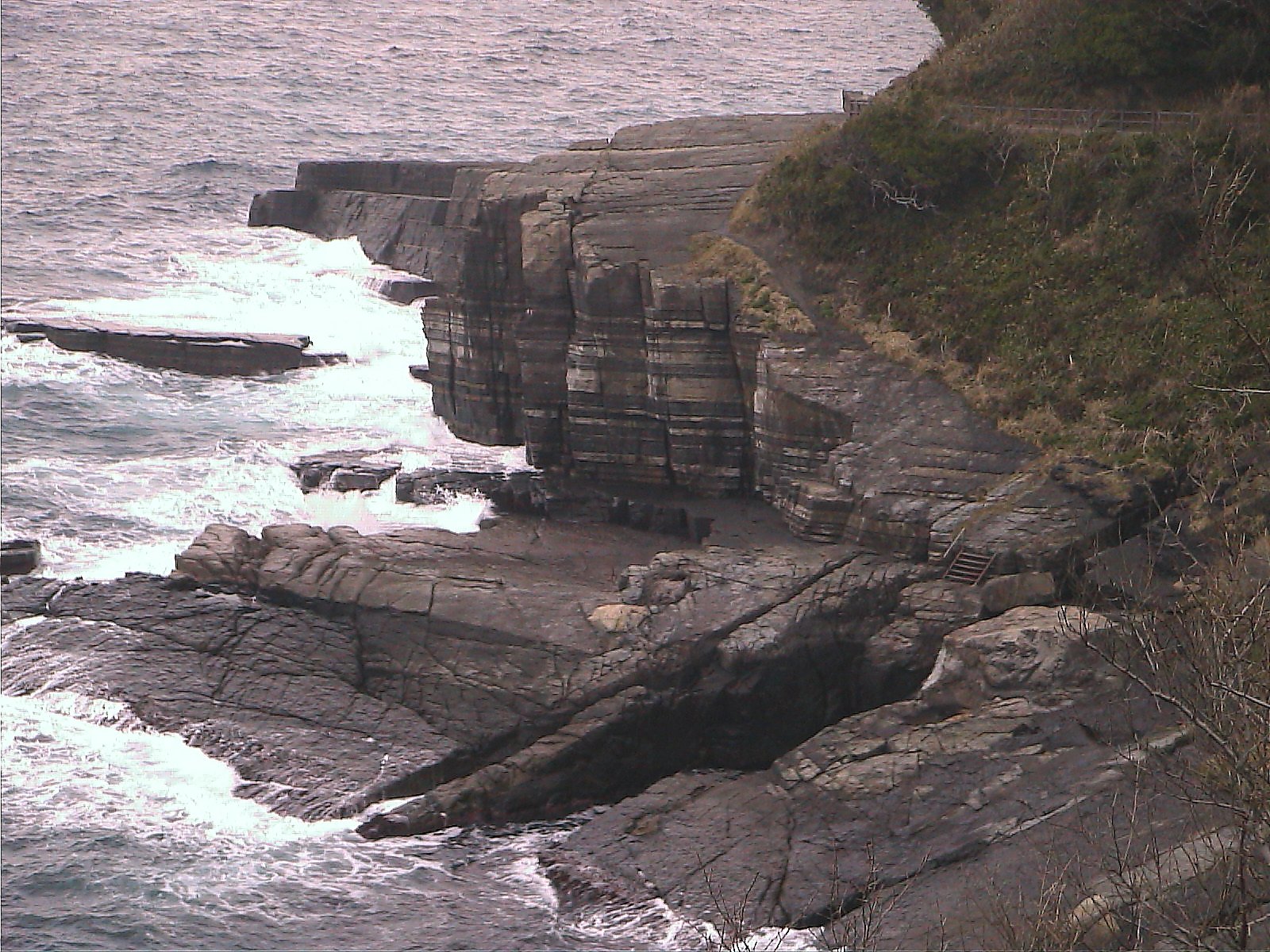 さて、今日のちょっと昔の写真。今日は、2012年正月に写した、山陰海岸国定公園の中にある、須佐湾にあるホルンフェルス断層の写真です。かつてここで、激しい地殻変動があったことを物語る風景です。
