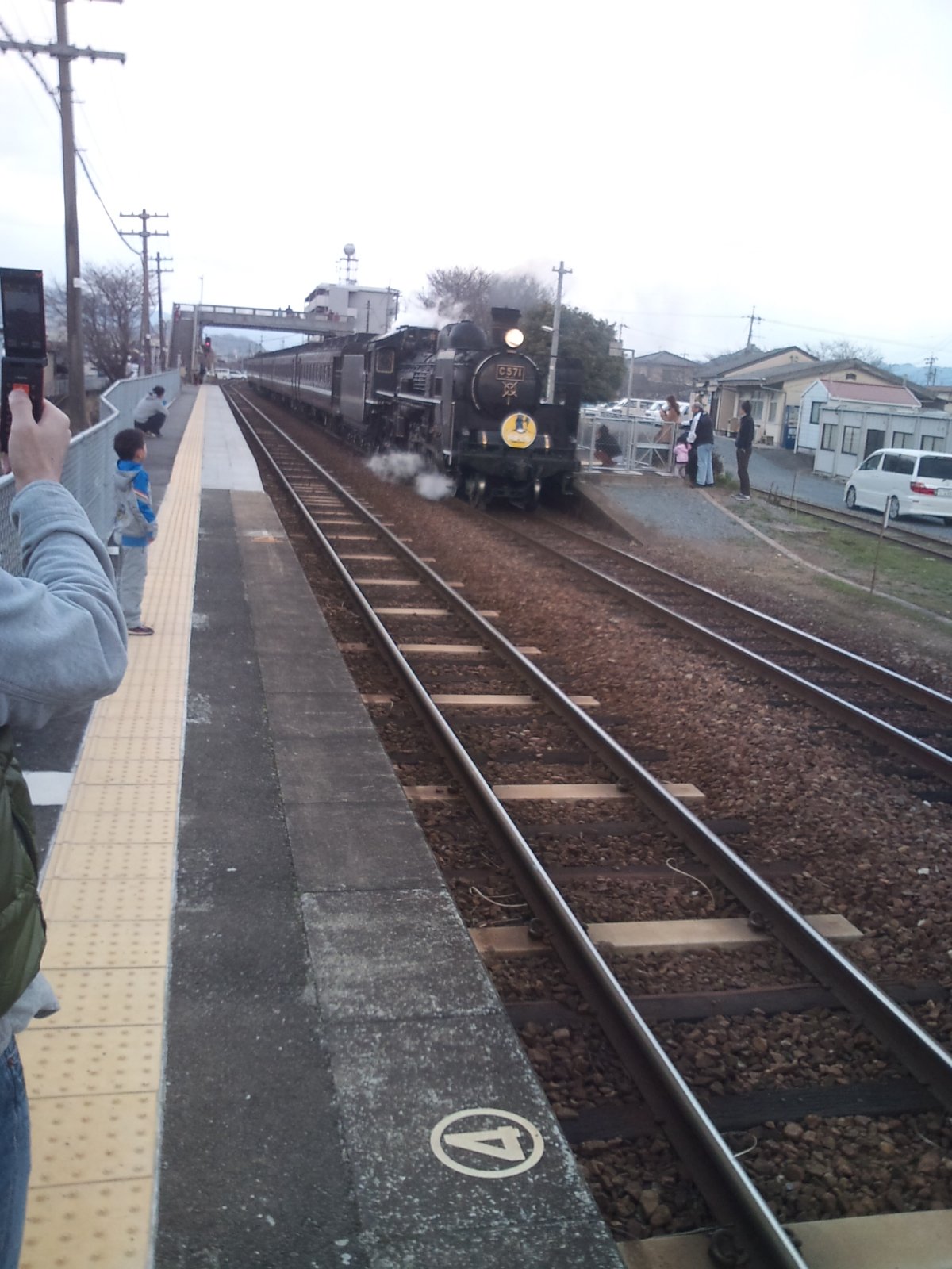 さて、今日のちょっと昔の写真。今日は大歳駅に運転停車中のC57‐1牽引のSLやまぐち号やはり均整の取れた美しいフォルムをしてますよね。