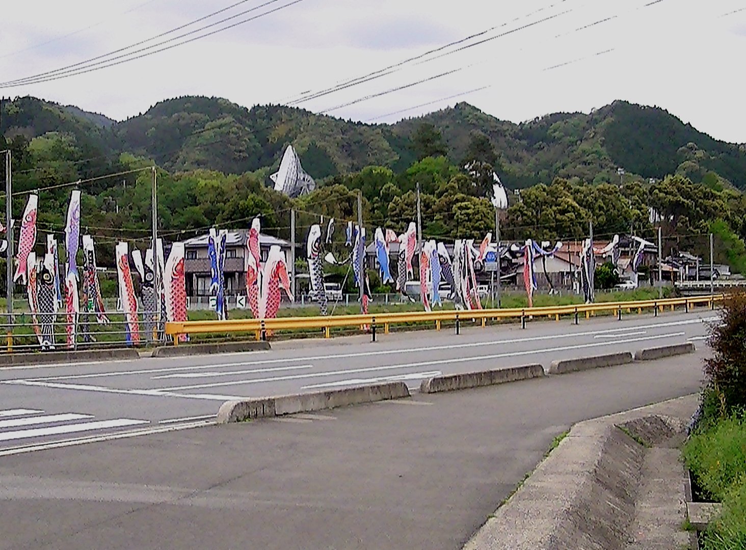 さて、今日のちょっと昔の写真。今日は2012年5月1日、山口市に帆の仁保川にかかるこいのぼりの様子。背後にあるのは、宇宙電波観測所のパラボラアンテナです