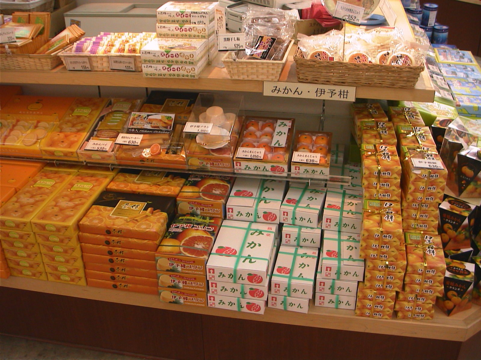 さて、今日のちょっと昔の写真。今日は来島海峡さーびおすエリアで売られていた、愛媛県お土産。やはりミカンの産地ということで、ミカンにちなんだお土産が多いですね。ちなみに私のイチオシのおすすめはミカン焼酎。これ、めっちゃおいしいです。
