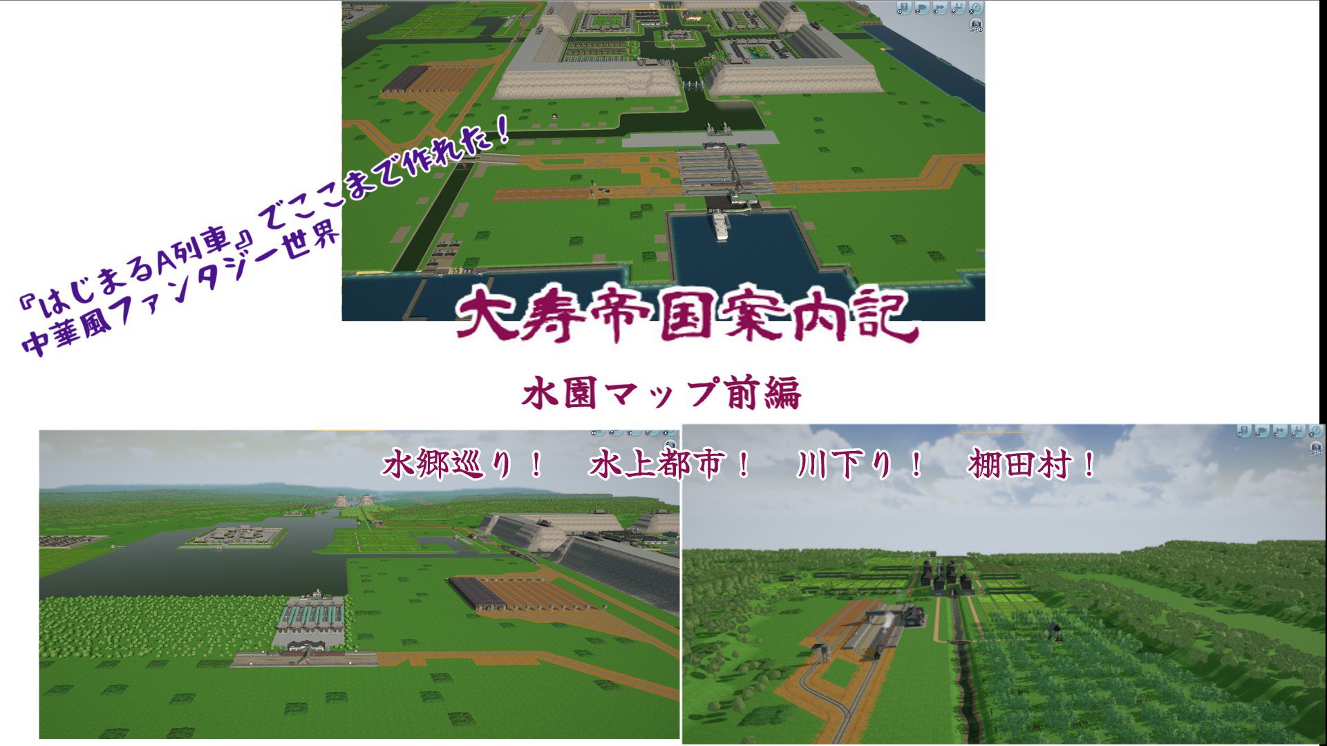 YouTubeに、鉄道会社経営ゲーム『はじまるA列車』で作った、鉄道ある中華後宮ファンタジーの拙作小説『寿国演義』のイメージ動画『大寿帝国案内記 水園マップ 前後編』を投稿しましたので、お知らせします。