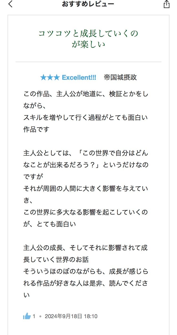 帝国城摂政様より拙作「スキル生え(スキルが生えてくる世界に転生したっぽい話)」におすすめレビューを頂きました。