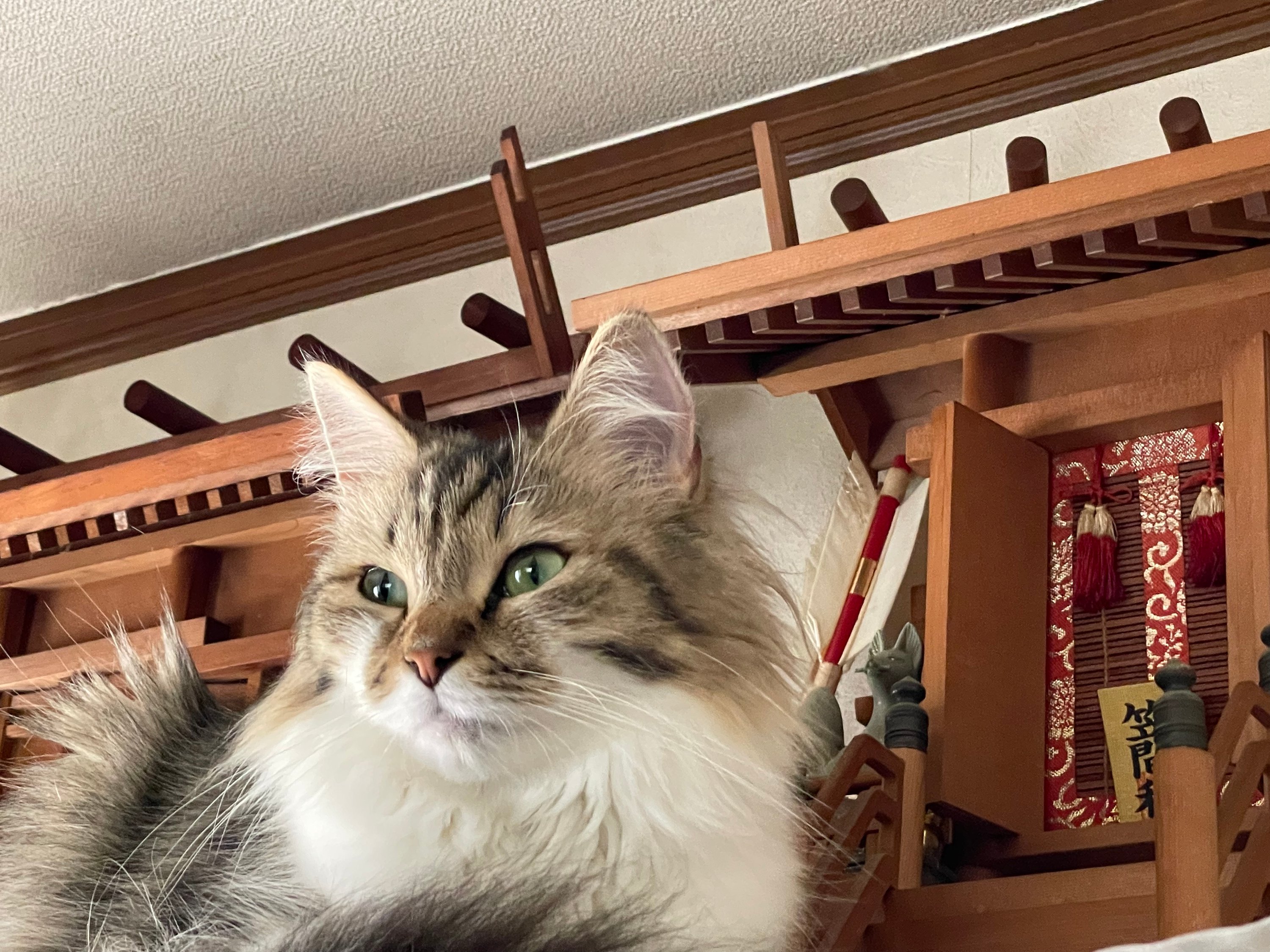 この写真のように我が家の神棚でも時折寛いでいますが、昔から日本や世界に伝わる猫の言い伝えの中には猫を神様として崇めている逸話もあり、日本にも猫神社があります。ノルウエージャンフォレストキャットについては北欧神話に登場し、豊穣の女神フレイヤの車を牽引していたそうです。いろいろ調べてみると面白そうですね。