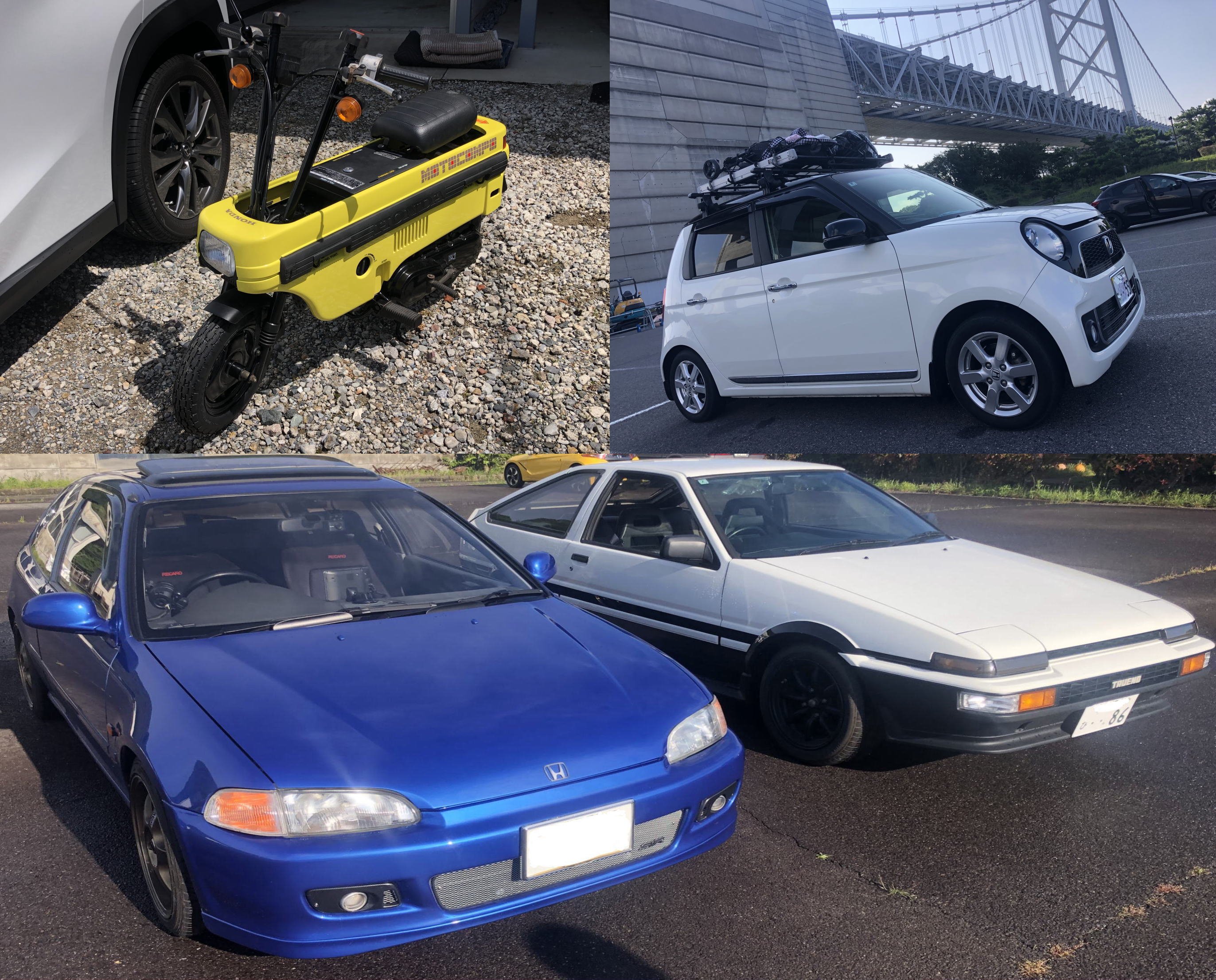 お盆休み、レストアの終わったシビックEG6と甥っ子が豆腐屋仕様に作成中のトレノAE86で地元をツーリング。上は最初の車がN360で始まった私が興味本位でいじった(パンダコパンダの)パンちゃん号と三月にレストアが終わったモトコンポです。(現在ナンバー付き)