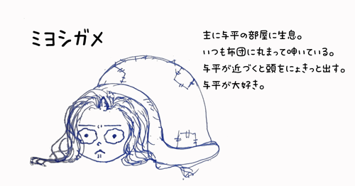 ふと思いついて、適当な紙の裏に青のフリクションで描いたものなのですが、妙に気に入ってしまったので、ちょっと公開。メソメソと与平の古い布団に丸まる深芳の図です(笑)