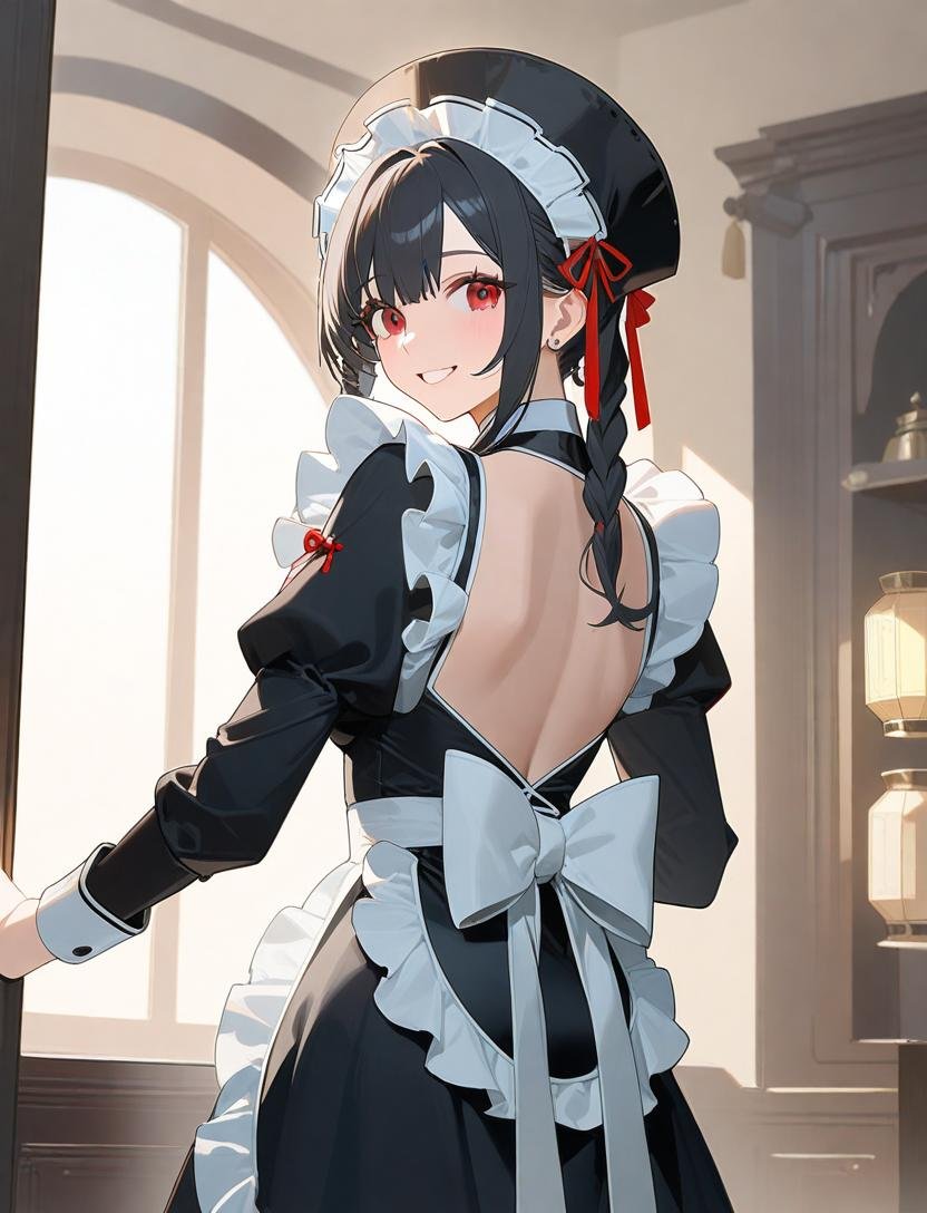 背中丸出しはだいぶ攻めたデザインのメイド服だと思う