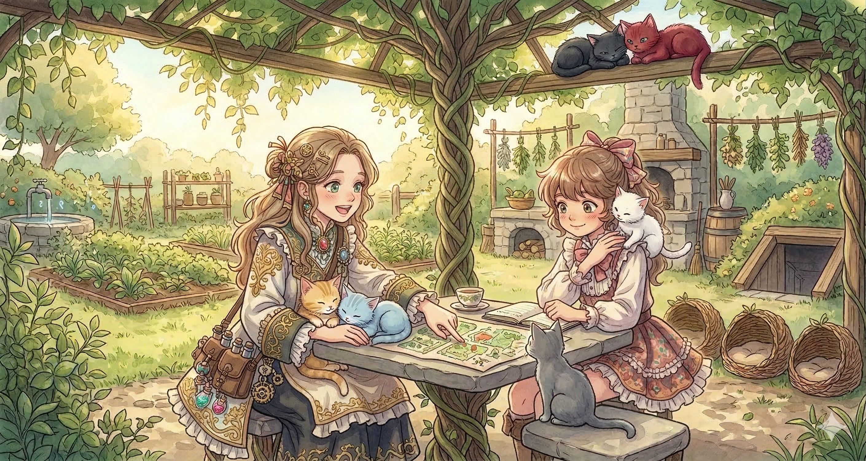 蔦の屋根の下のティータイムは、まだ続いていた。シェリーの鞄には猫とポーション瓶の木彫り。リコの鞄には猫と布の木彫り。どちらも蔦の紐が金具に揺れている。