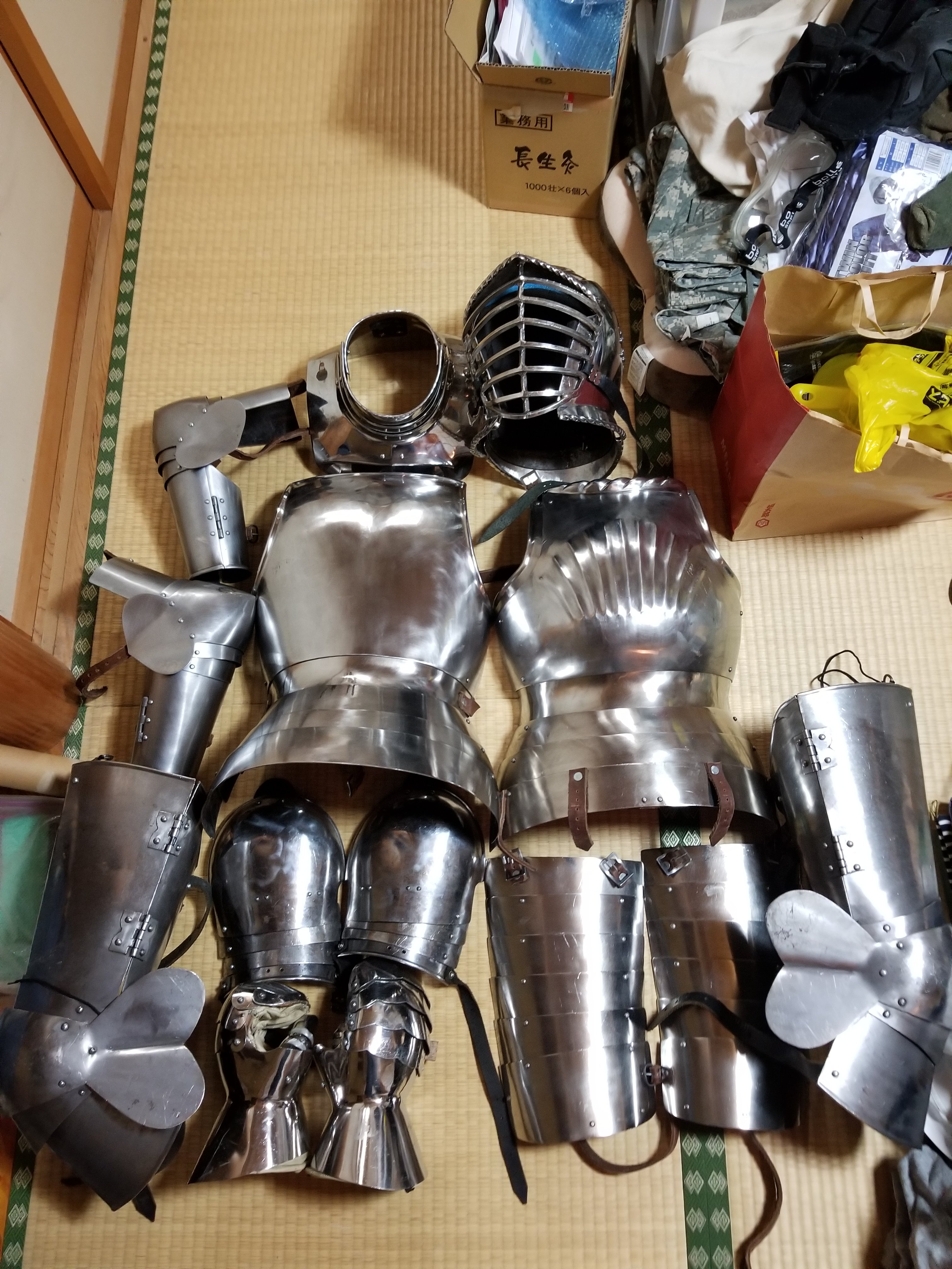 以上が筆者の装備です。脛鎧を付けない16世紀傭兵風の装い(3/4アーマーと呼ぶ)ですね。拙作「鍋で殴る異世界転生」の主人公とルルの装備より上等品です(材質の強度は彼らの方が高いけどね)。主人公より上等な甲冑を着ながら小説を書くと大変気分が良いのでオススメです。