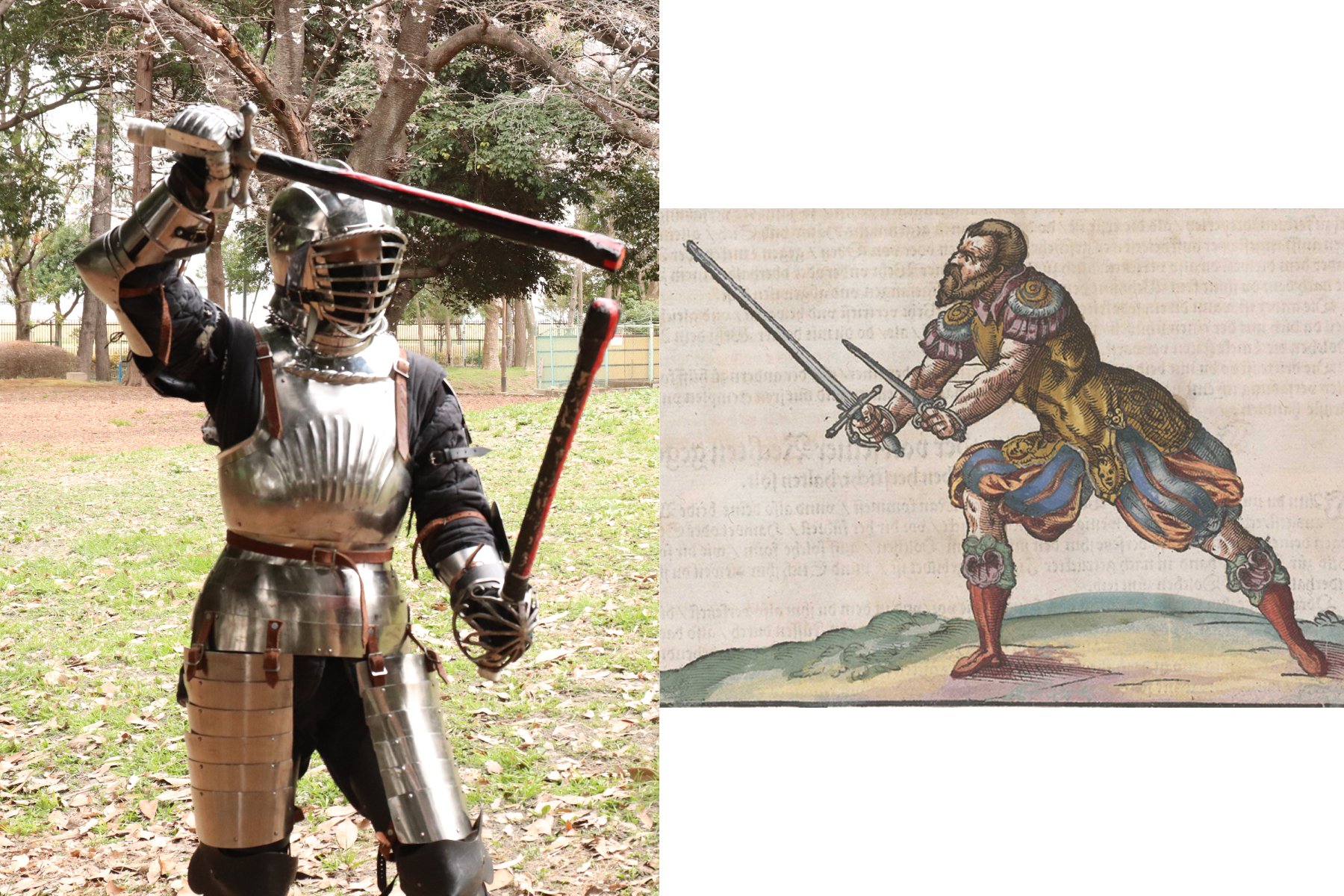 僕がやっているのは競技(見た目が何でも、革鎧と鎖帷子を着けているとみなす)、マイヤーのは素肌剣術(防具を何も身に着けない)という違いがありますが、それがこういう差異を生んでいます。