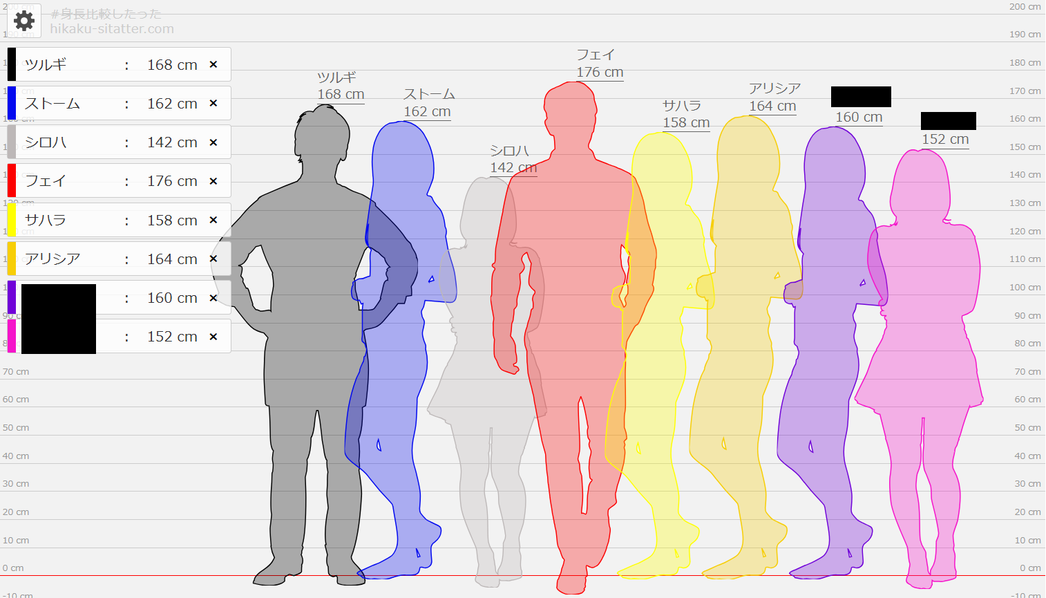 そして、「身長比較したったー」というサイトを見つけた事で、キャラクターたちの身長を確定させることができたり。下がその画面です。