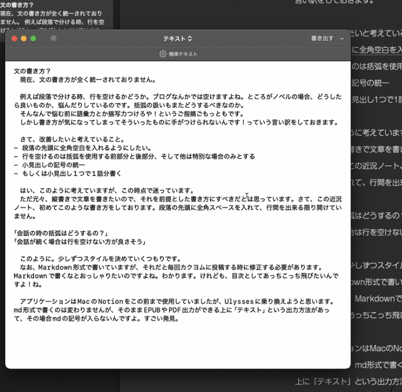 アプリケーションはMacのNotionをこの前まで使用していましたが、Ulyssesに乗り換えようと思います。md形式で書くのは変わりませんが、そのままEPUBやPDF出力ができる上に「テキスト」という出力方法があって、その場合mdの記号が入らないんですよ。すごい発見。