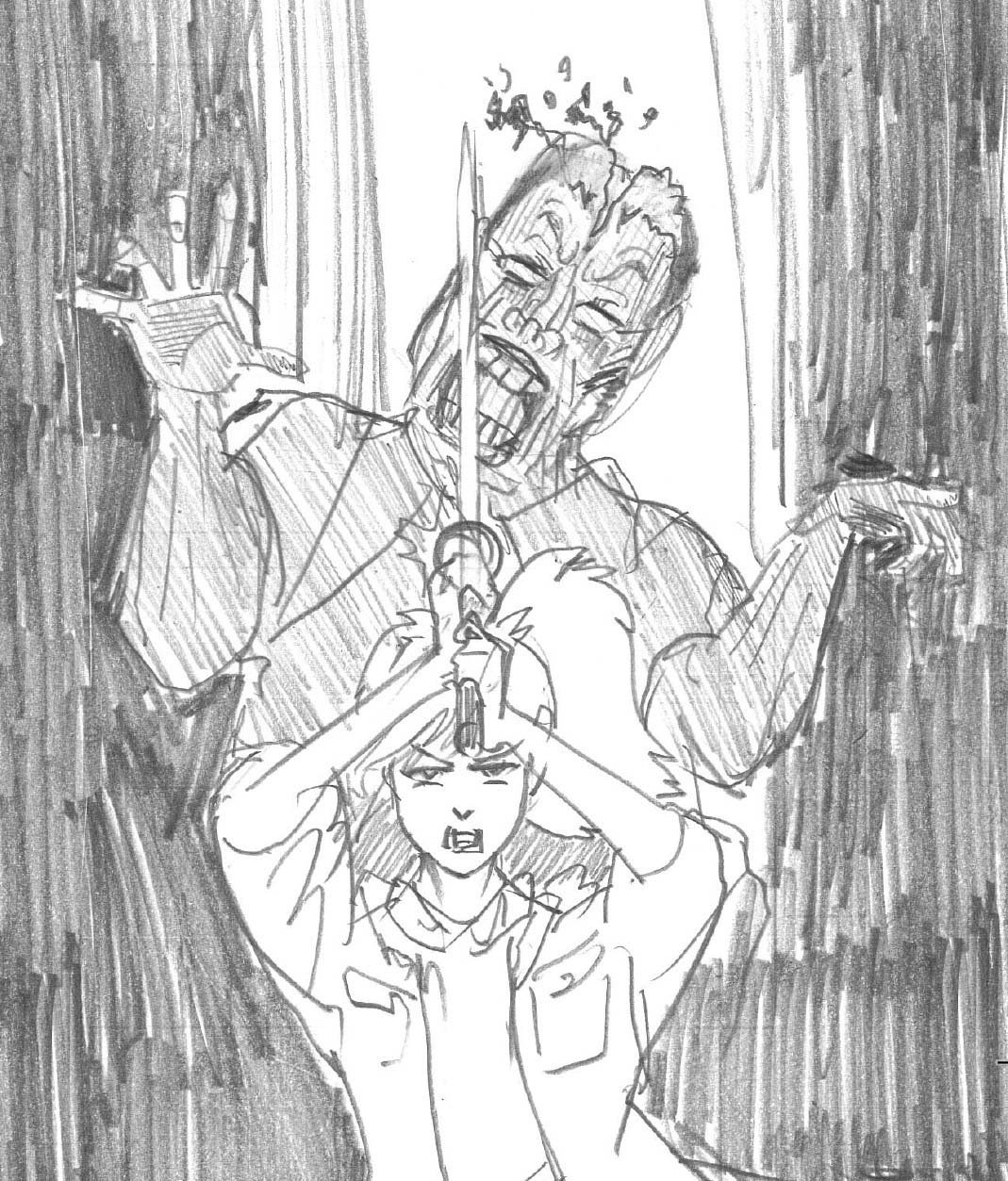 エルザは咄嗟に大上段への構えをしつつ、背後のガルベスの額を突き殺し、そのままバクスへ上段からの振り下ろしを放った。