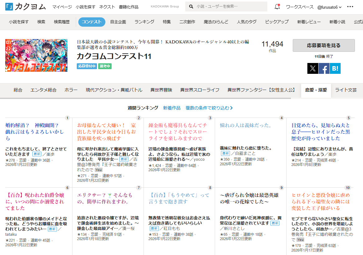 カクヨムコン11恋愛部門週間第2位と第10位に2作品ランクイン中です