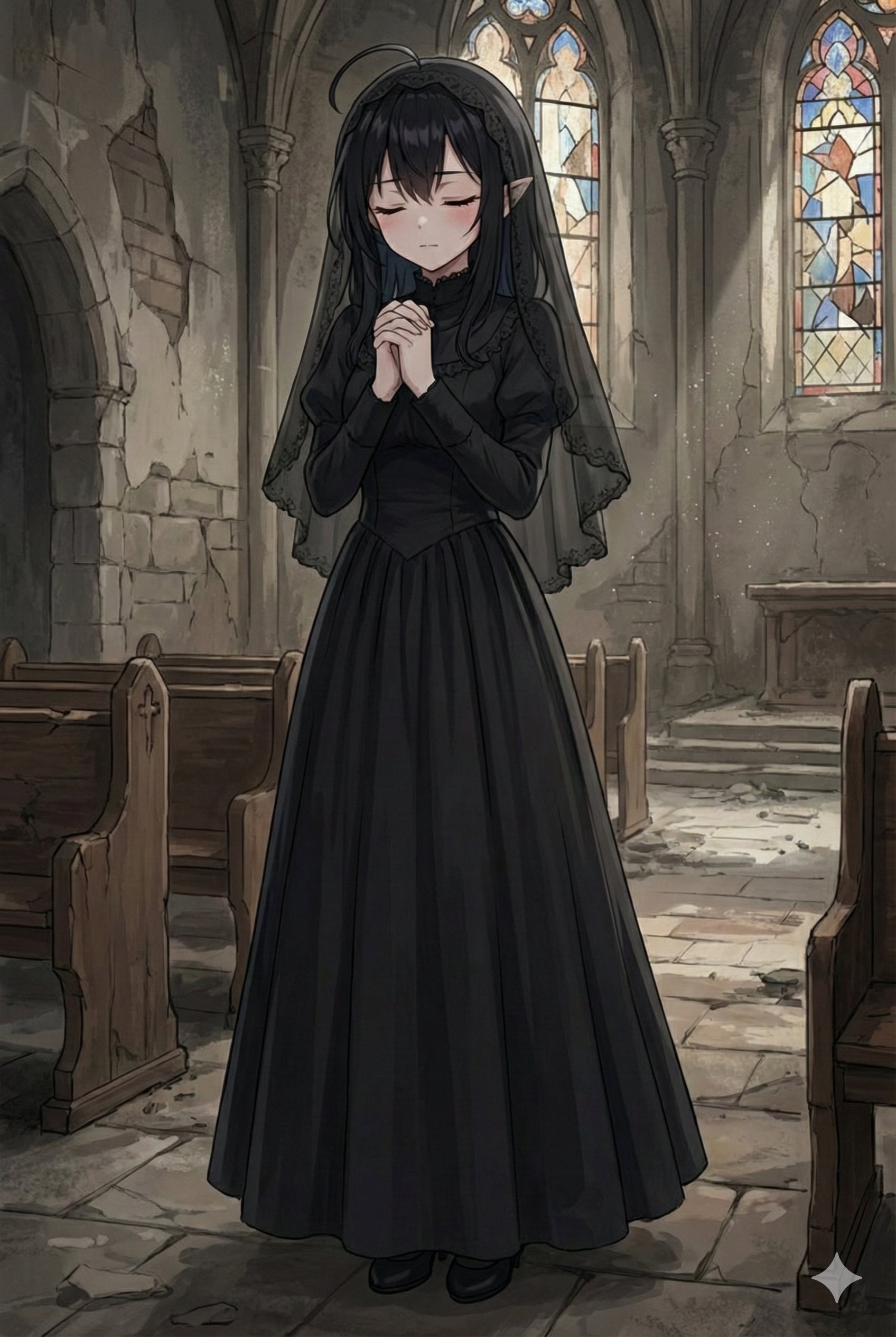 彼女は指をパチンと鳴らす。刹那、彼女の周囲は闇に包まれ、背中にあった羽が隠れてしまった。代わりに身にまとうのは、黒い喪服。
