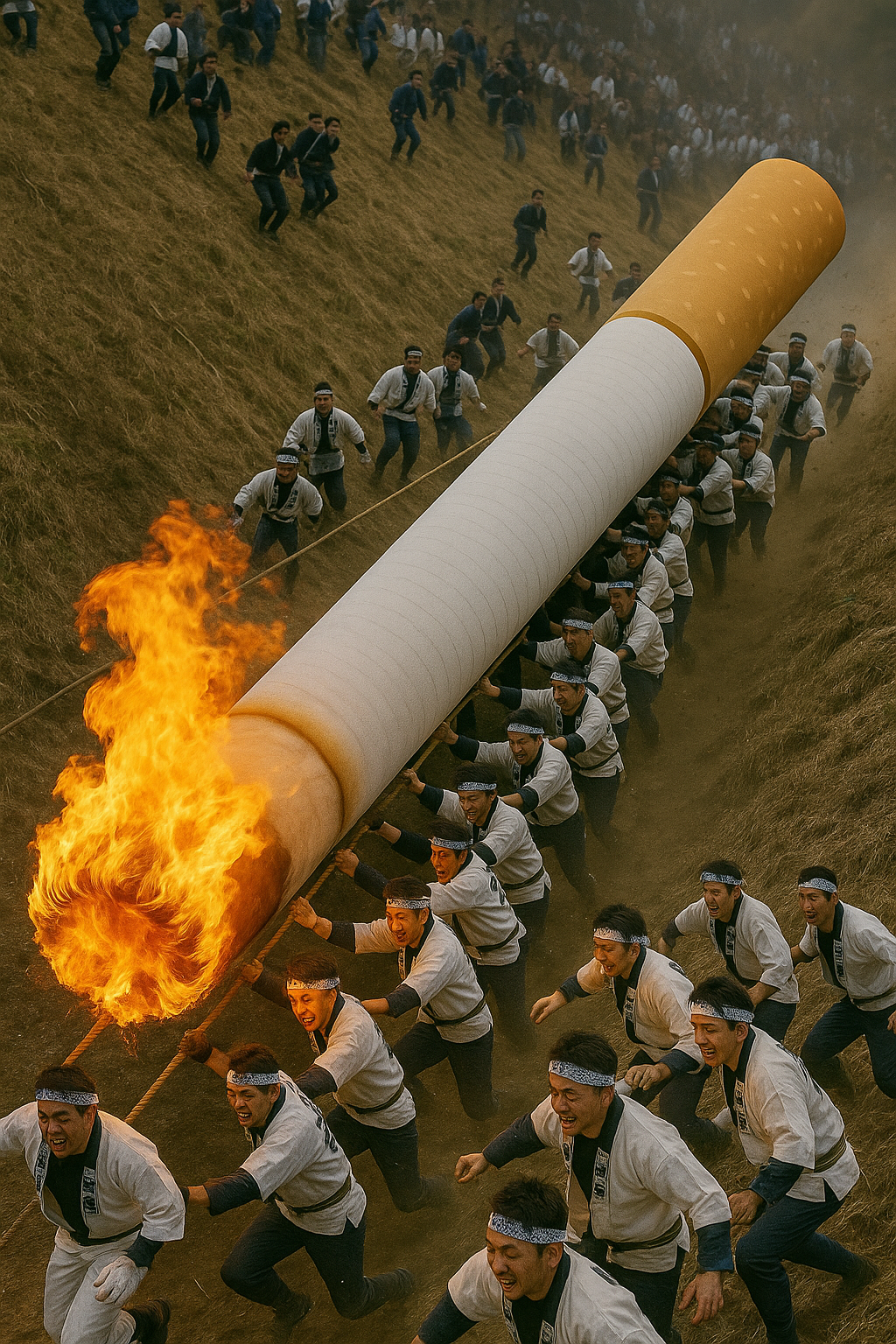 タバコに見立てた燃える御神木が丹沢の急坂を滑り落ち、それに群がり取り付く屈強な喫煙者たち。最後に柱に乗っていた者が今年の煙男(けむお)。