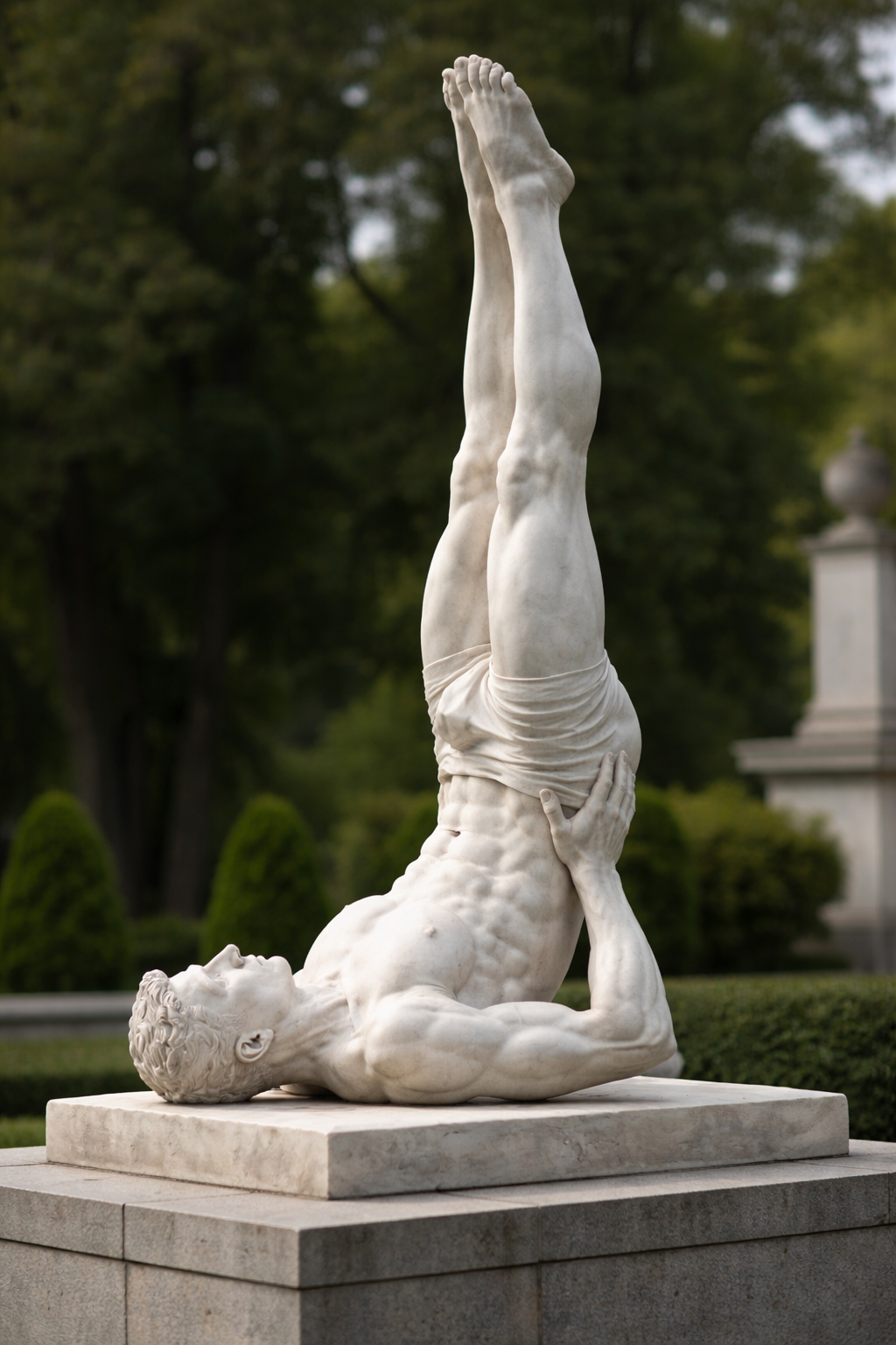 プロンプトはたしか「男性が背中を床につけて足のつま先を天に向かってまっすぐ伸ばしているポーズの銅像」みたいな入力だったと思います。生成されて「銅像と違う…!」と思ったのですが、一発目にしては出来が良かったので即採用となりました。