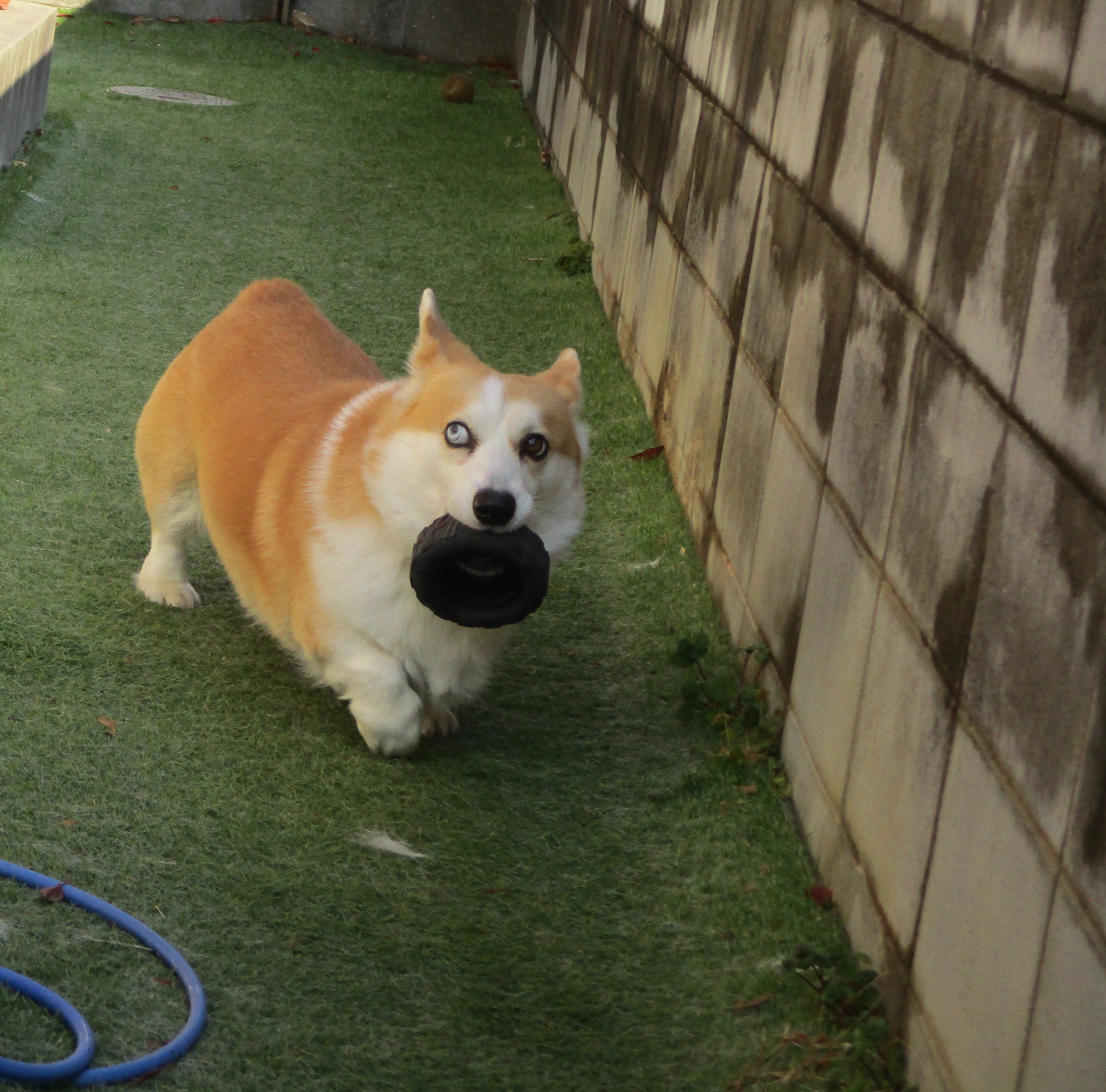 コギの背中にぶち当てているおもちゃ(タイヤ型)です。