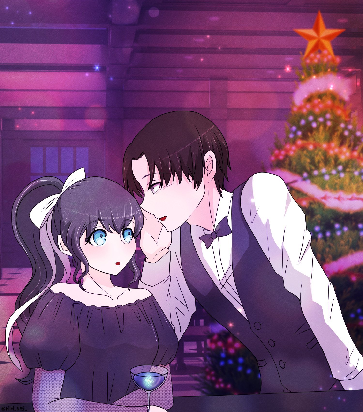 背後には大きなクリスマスツリー。そしてムーディーな空間。ここはおそらくバーの店内なのでしょう!彼が何を耳打ちしているのか、壁はとても気になります( ˘ω˘)