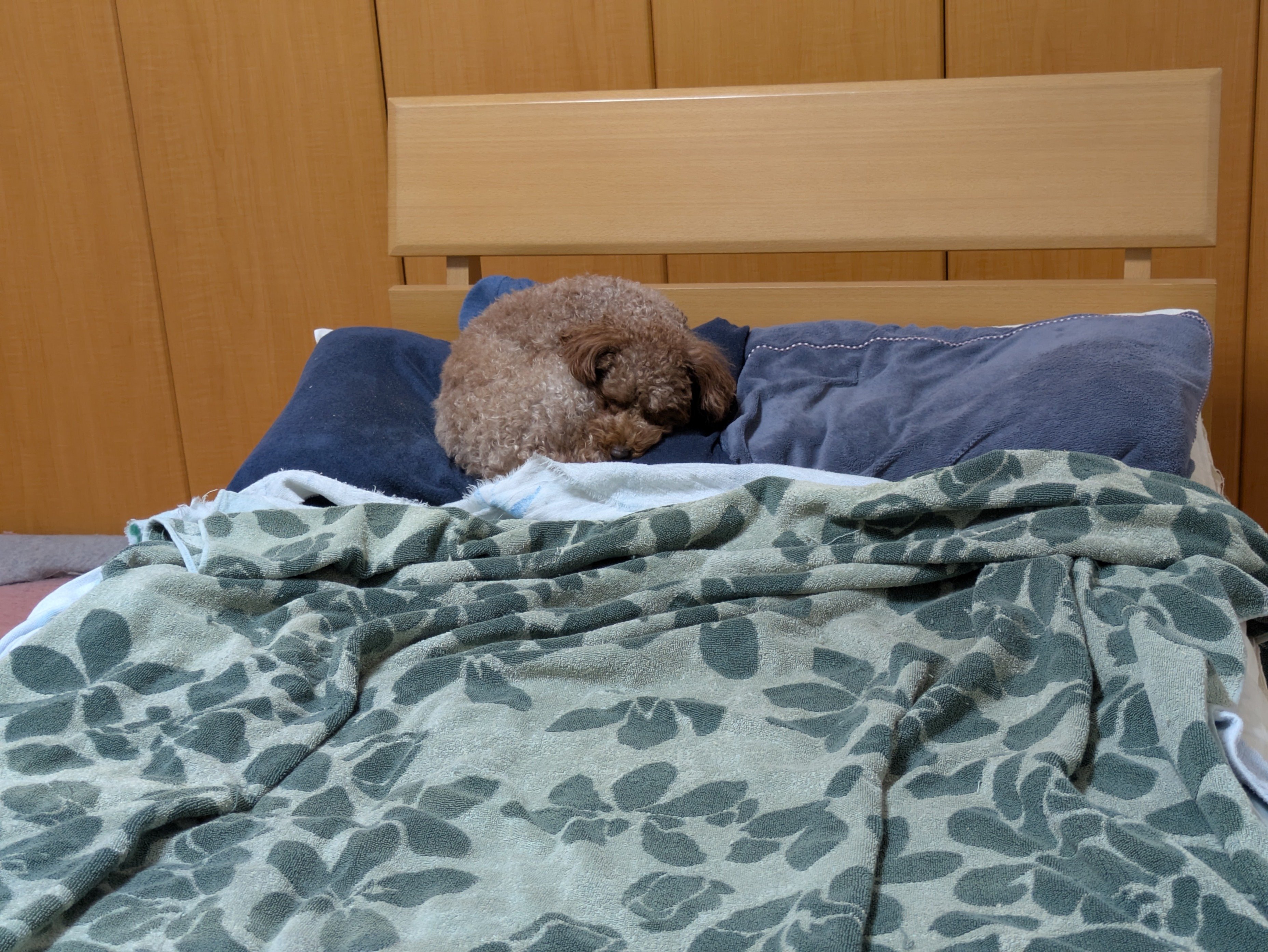 つまりカクヨムコン期間中の近況ノートは毎回「今夜の犬画像」を入れていこう、と。あるいは「今夜の」でなく「今日の」にするかもしれませんが、とりあえず今回は前回同様、近くのベッドで休んでいる犬の様子。