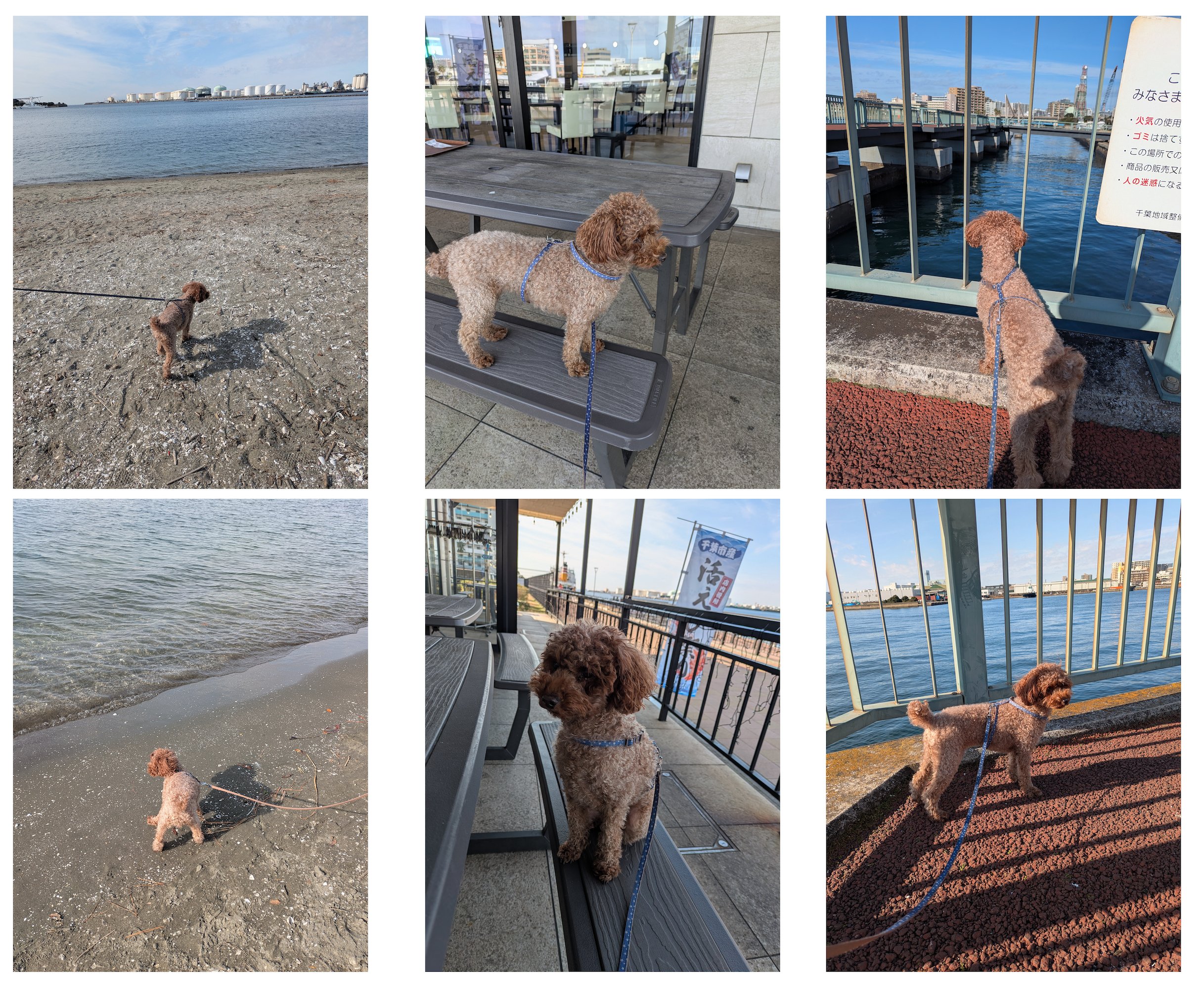 それら公園やレストランからは離れた場所ですが、買物したスーパーも海の近くだったので、家族の買物を待っている間は、また海が見える辺りを歩いたりしていました。小さな桟橋もあって、特に桟橋の上は海風が気持ち良いらしく、犬にとってもお気に入りの場所のようです(右側の写真2枚)。