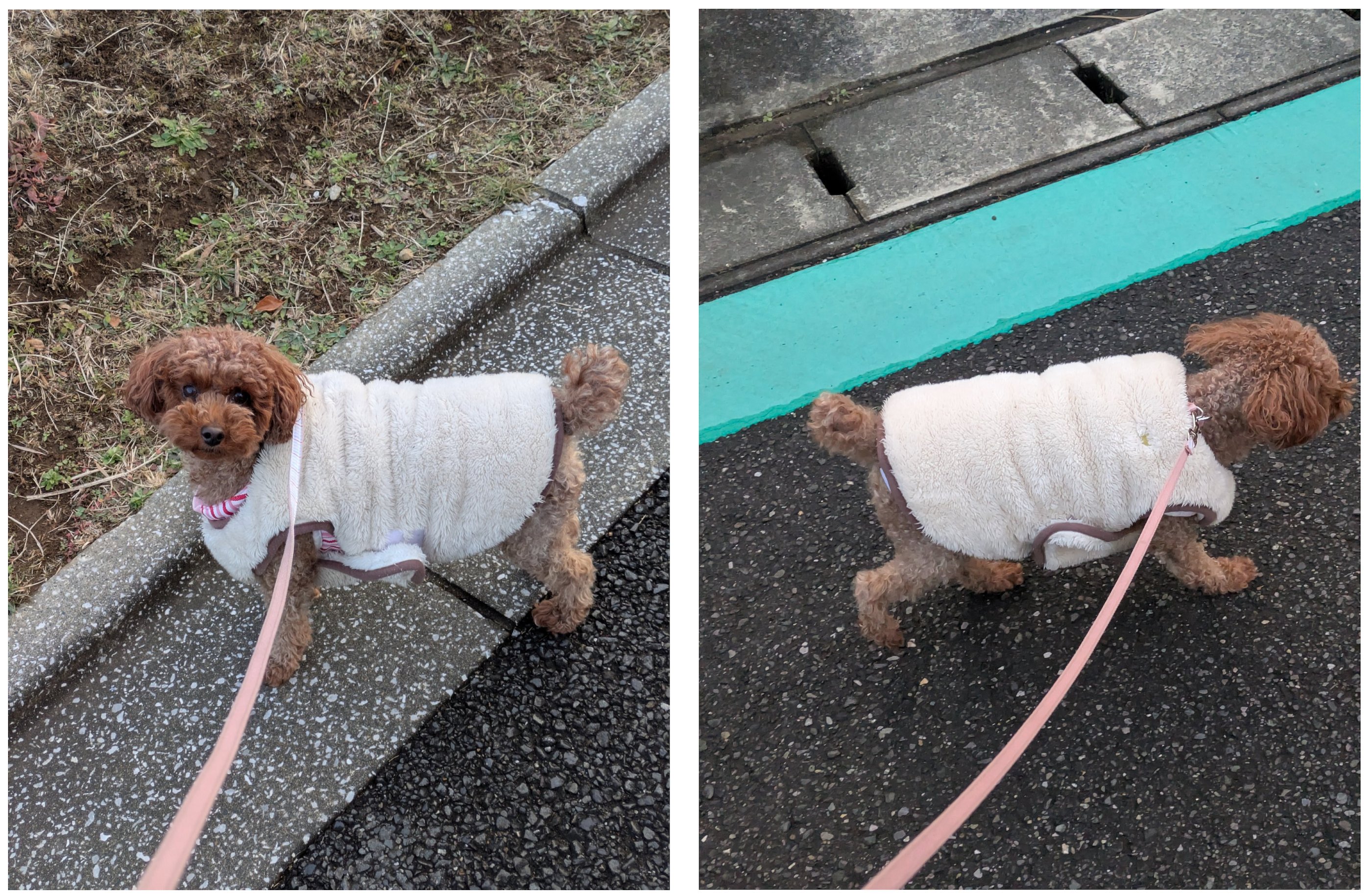 まだ暗い時間帯である朝の散歩(街灯の照明で一応写真は撮れている)よりも、こちらの方が犬の服装もわかりやすいですよね?