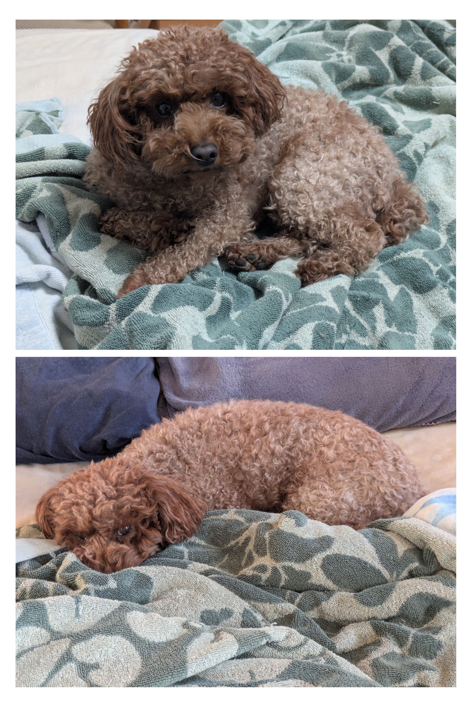 時間は大きく開いていますが、どちらもベッドで休んでいるだけなので、同じような姿ですね。室内照明と窓から差込む日光の違いにより、全体的に色合いが少し違って見える程度でしょうか。