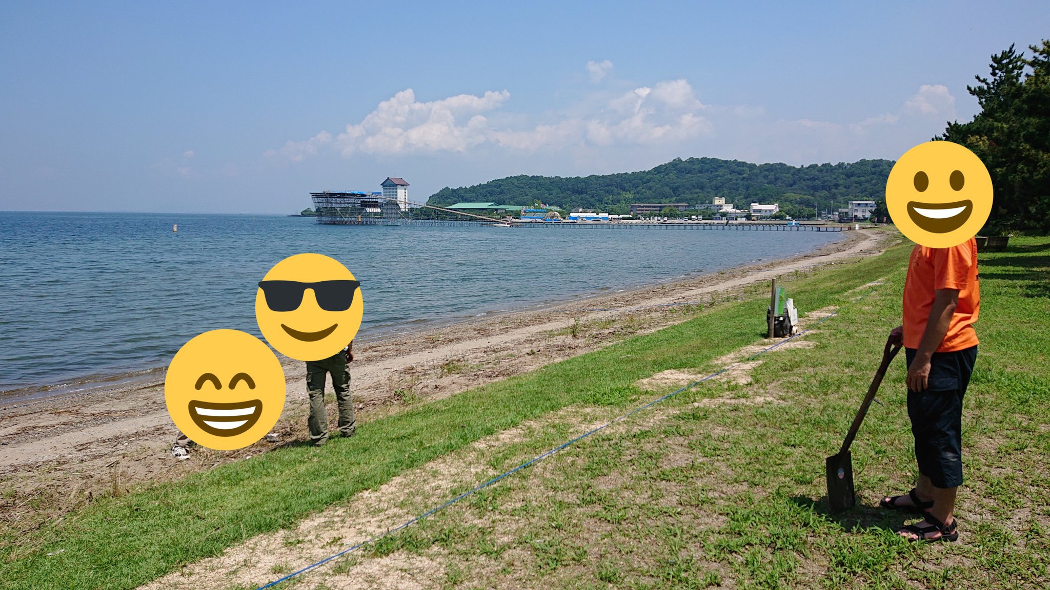 https://kakuyomu.jp/works/16816700426378377467現地の様子が分かる写真を添付しました。大会当日は湖岸に沿って各チームの機体が並び、奥のプラットホーム(スロープの先の建物)へと進んで行きます。