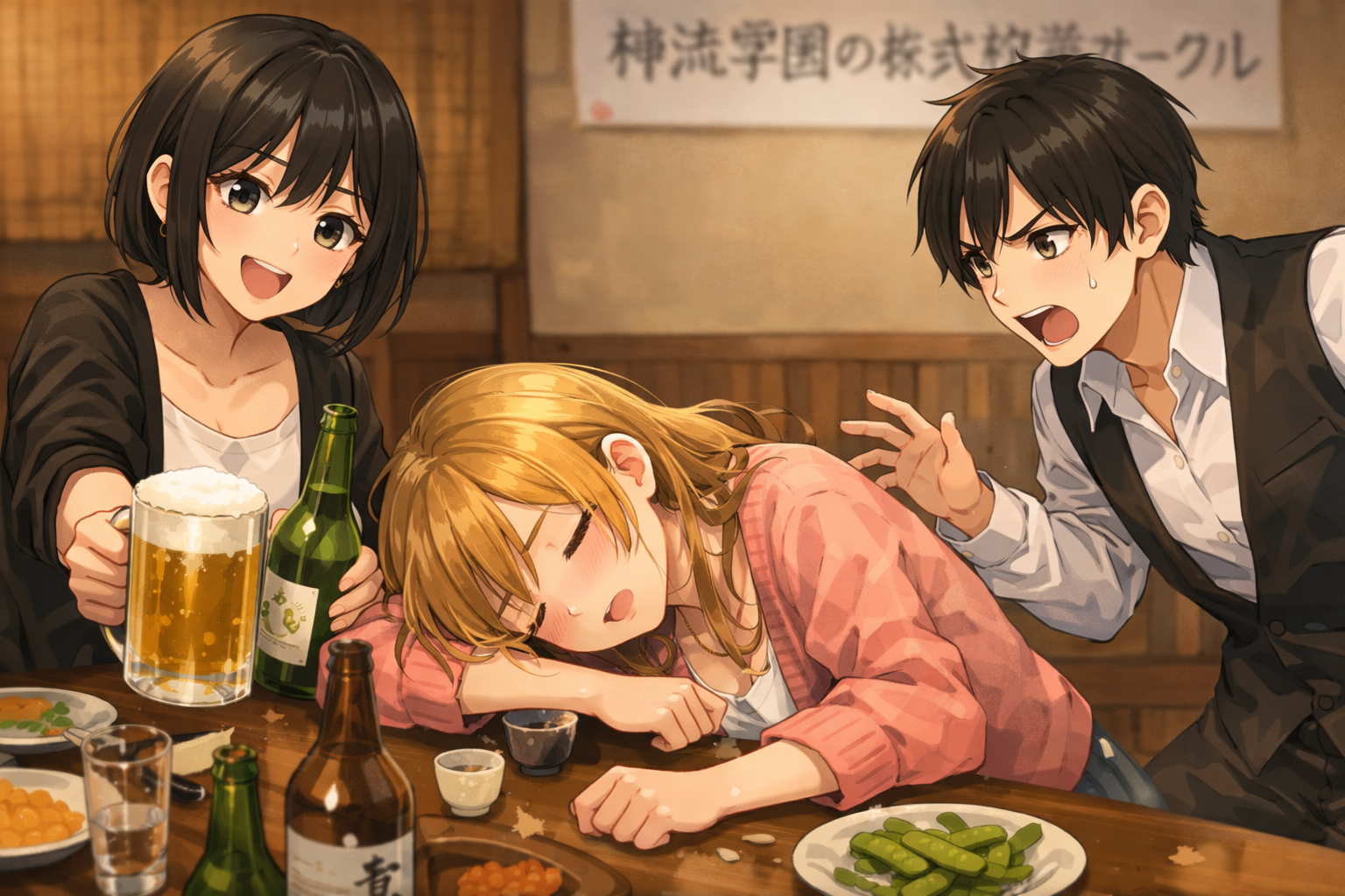 神流学園ゆるゆるサークルの新歓コンパで酒を勧める浅見雪菜と酔い潰れる大河内舞華と止めに行く石動楔