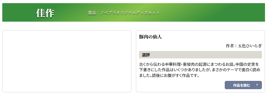 このたび、そのコンテスト――ノベルアッププラスの「歴史×商い短編小説コンテスト」にて、本作が佳作に選出されておりました。