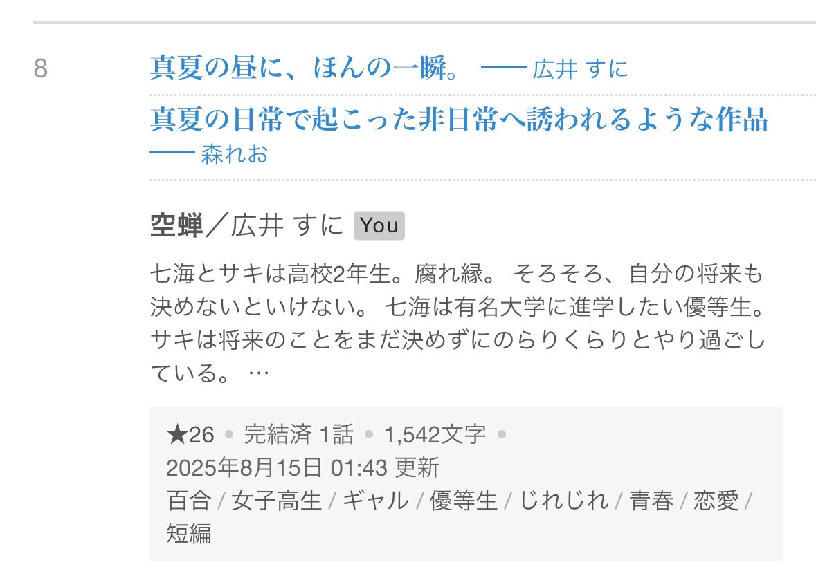短編百合小説「空蝉」ですが、恋愛カテゴリ日間ランキング8位でした。