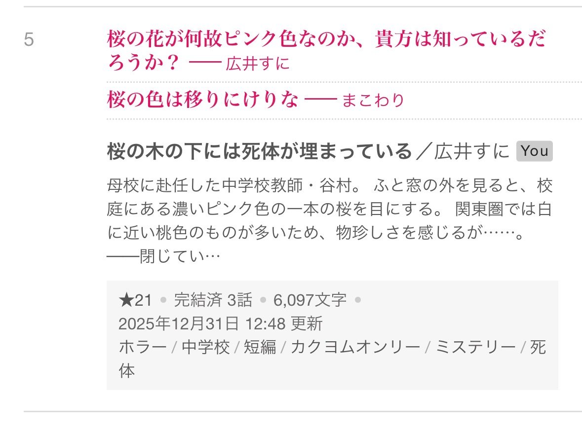 そして、昨日公開したホラー短編「桜の木の下には死体が埋まっている」