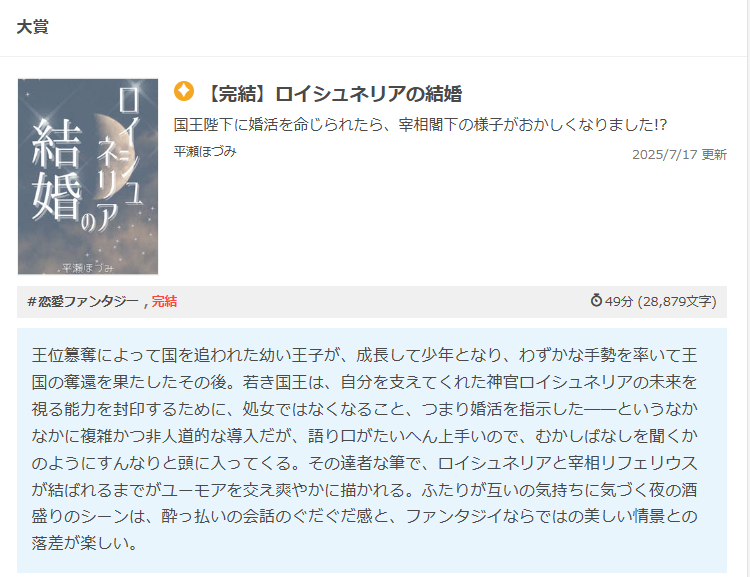エブリスタさまの新星ファンタジーコンテスト「両片思い」にて、拙作「ロイシュネリアの結婚」が大賞をいただきました!