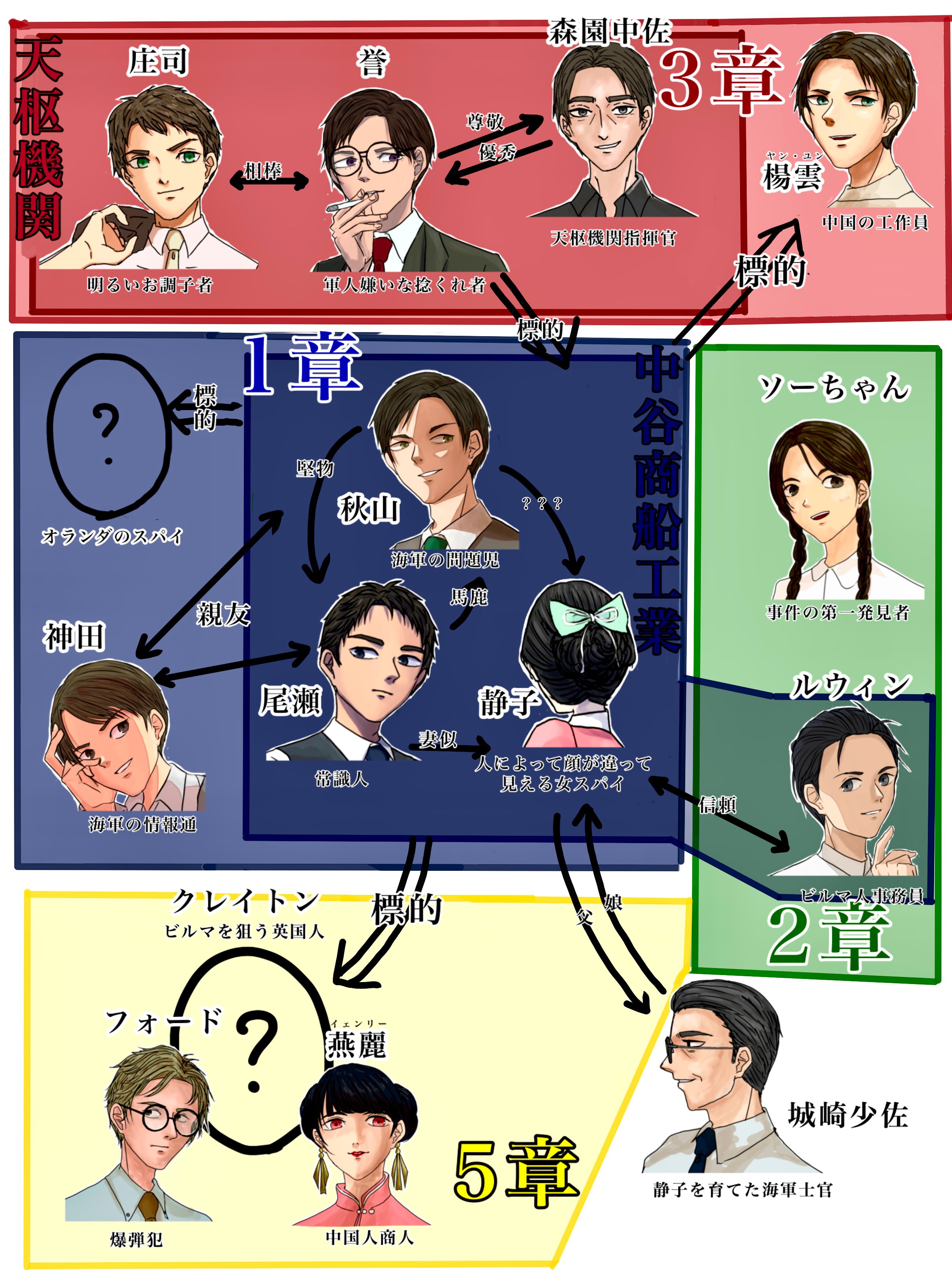 誰に需要があるんだ?って感じですが、拙作「ネイビーカラード・モダンガール」の相関図を描きました。自分絵ですみません。貧乏でな、人に頼むお金がねぇんだ……。