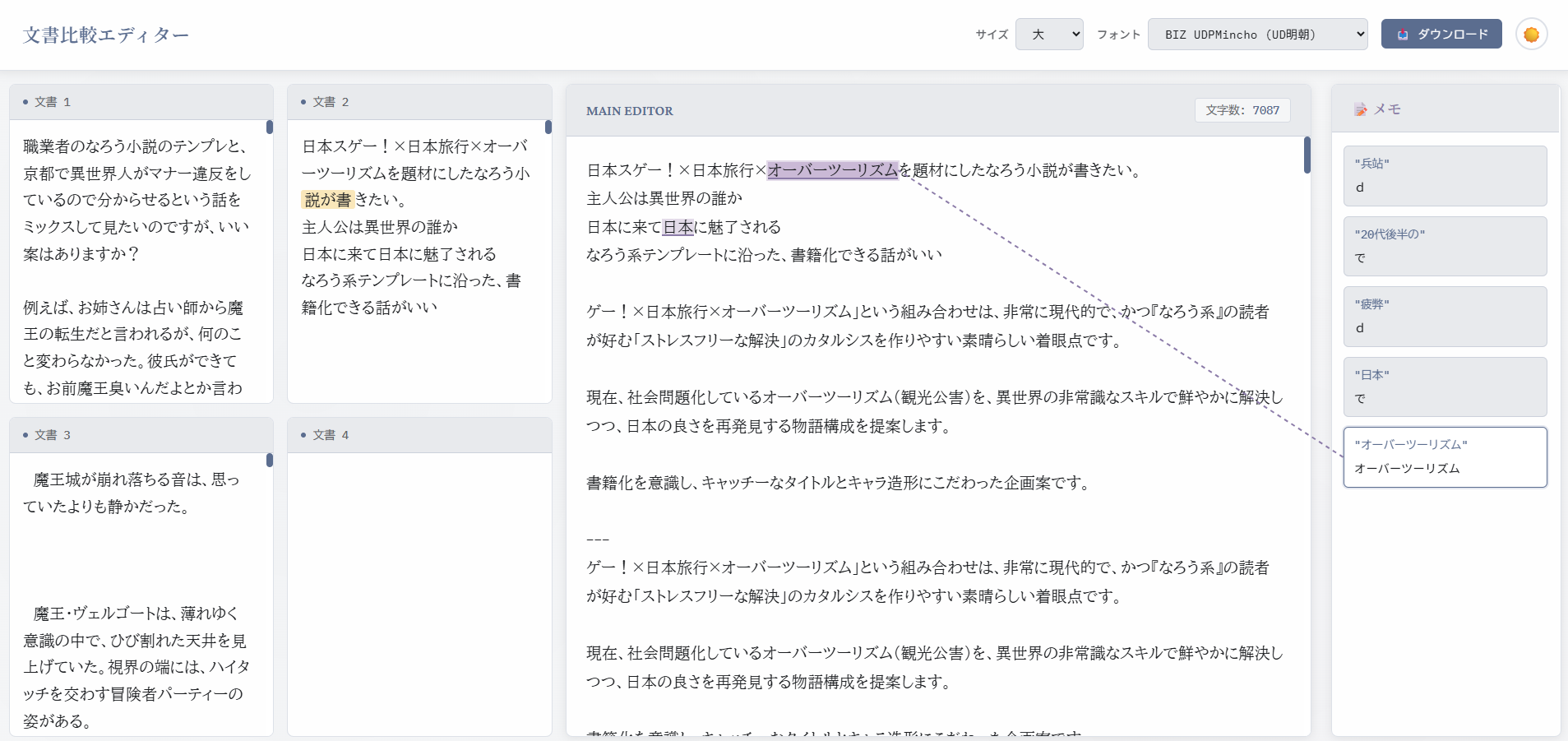 というわけで、作りました。最大四つの文章と比較しながら小説の執筆ができるアプリです。ご自由にどうぞ。