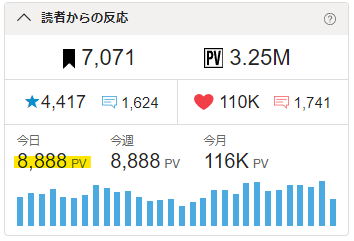 🖋夕方も順調ですね。今日のPV「7777」から約1.5時間で「8888」に到達!🎉✨