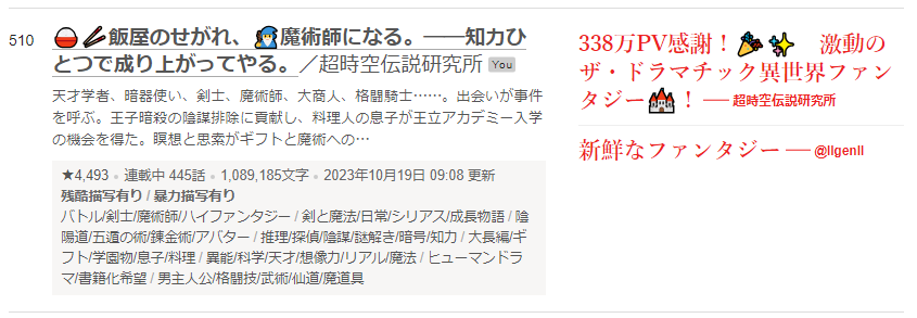 🖋異世界ファンタジー部門累計ランキング:510位。😃