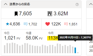 🖋今月のPVは110kを突破!🎉✨ 11日平均で10k/日をクリア!😃