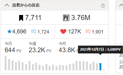 🖋昨日のPVは5580。累計376万PV突破しましたが、最後は頭打ち。