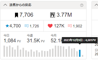 🖋今朝の時点で12月度のPVは52k。10日平均で5k/日をクリア済。👍