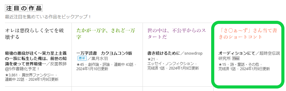【記録用】「短編賞創作フェス」参加作品が「注目の作品」に載った。