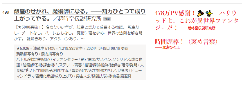 🖋一方、異世界ファンタジー累計ランキングは499位に上昇。🆙🎉✨