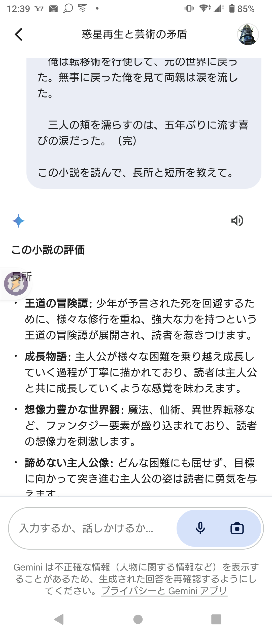 Androidで使えるGoogle Geminiアプリ。AIアシスタントに小説を読ませて感想をもらうという使い方をしてみた。