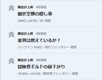 「幽世」が頑張って順位改善しました。「釜男」は初登場でいい位置にランクイン。