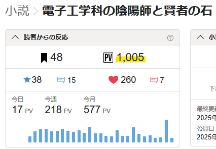 代表作以外の作品はなかなかPVが伸びず、スポットライトが当たらないマイナー作家ですが、1000PVは作品として一つの存在証明になるかなという感じです。