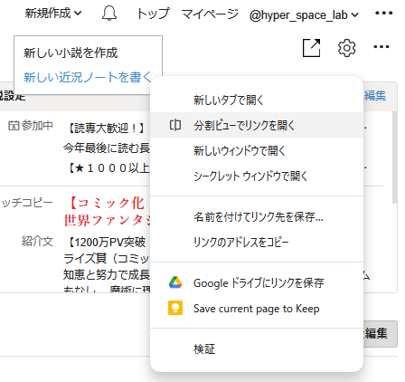 「分割ビューでリンクを開く」という右クリックメニュー。